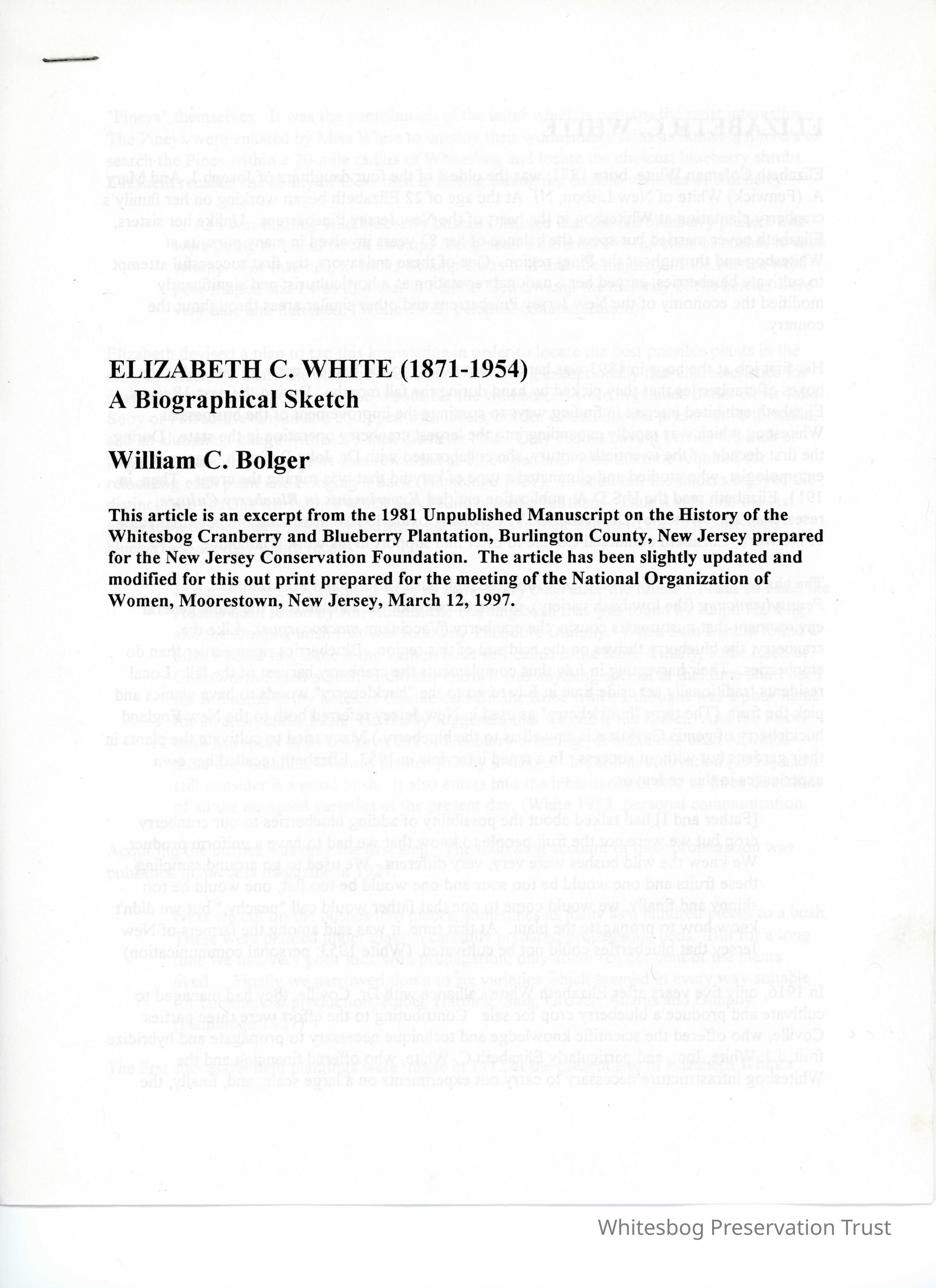 This is a biographical sketch of Elizabeth White written by William C. Bolger in 1981, as a part of an unpublished manuscript titled "History of the Whitesbog Cranberry and Blueberry Plantation, Burlington County, New Jersey".
